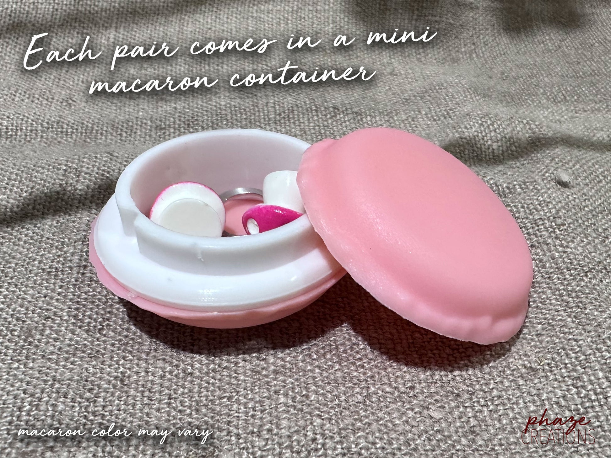 When not wearing them, store your earrings in the snap-lid macaron storage container.
