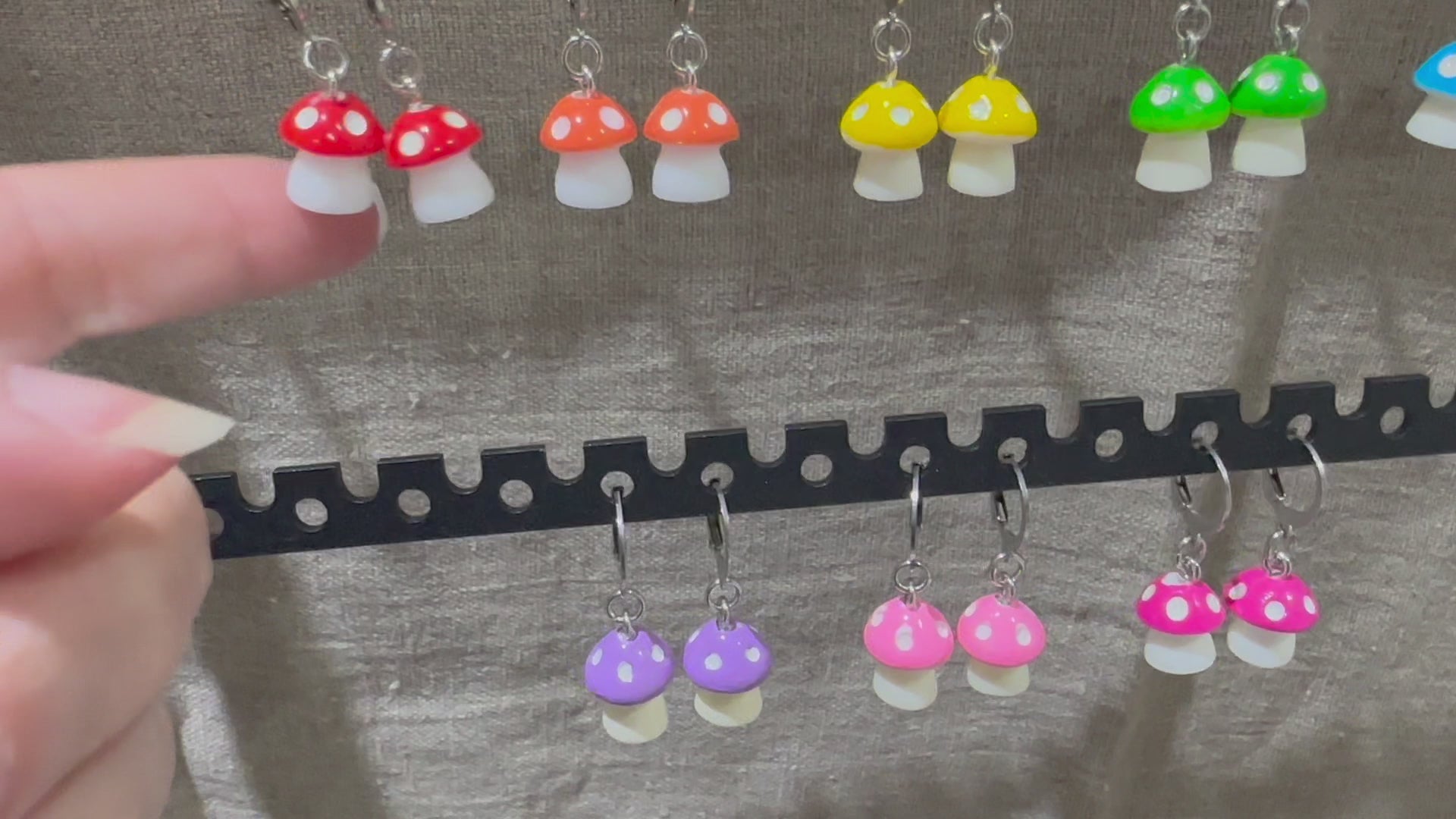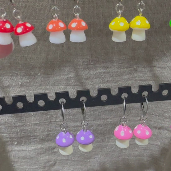 Choose your favorite color! These cute mushroom dangle earrings are made with stainless steel leverbacks, which are much more secure than French hooks. Leverbacks include a "locking" lever that swivels up to keep earrings securely in the ear's hole. No more lost earrings and no poking stem!