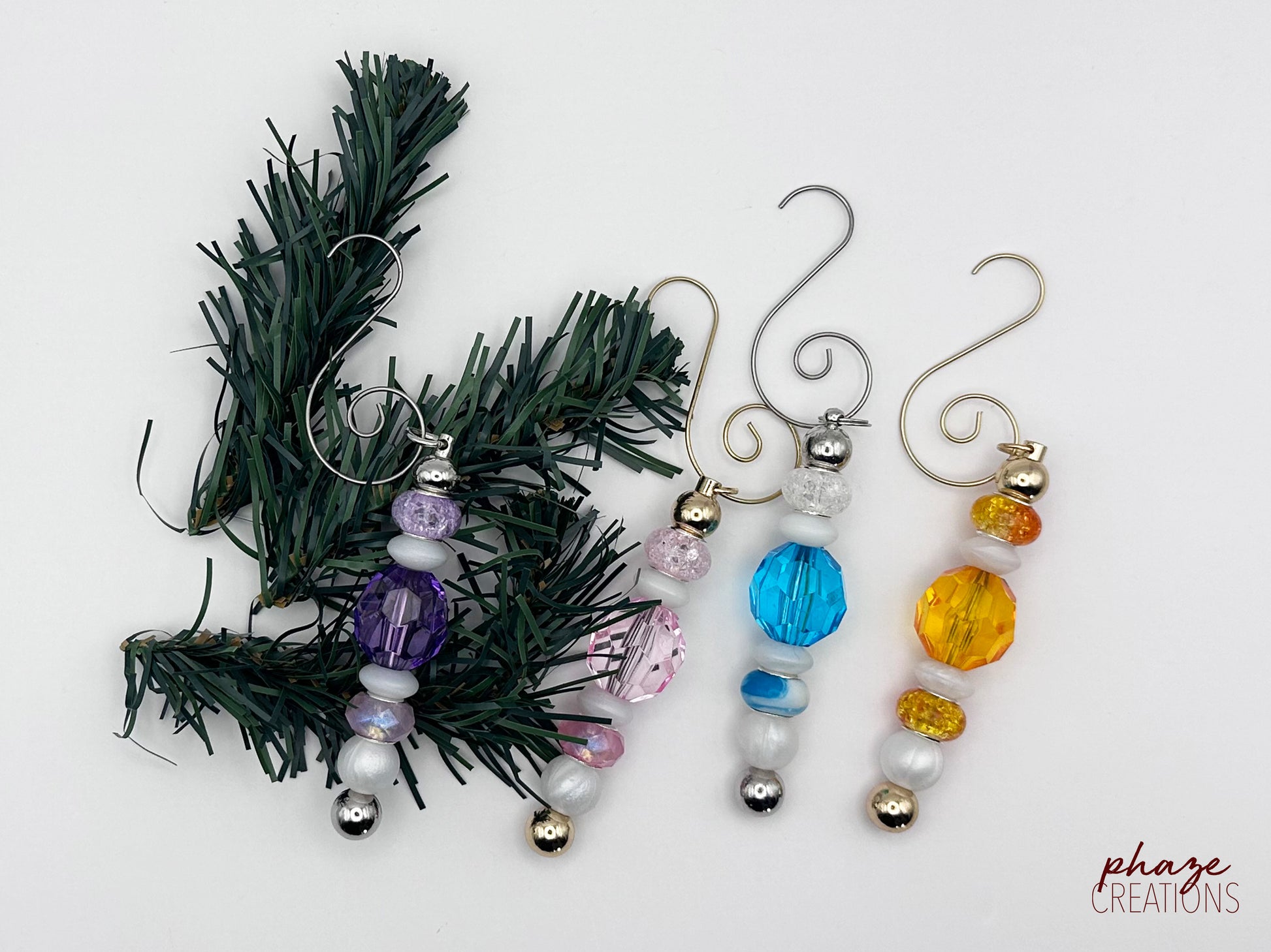 These crystal dreams inspired ornaments double as keychains, car charms, and backpack bling. Created using acrylic, metal, and silicone beads and upcycled metal keychain bars, each adds unique color and gleam. The large, oblong, crystal-like ball has the right amount of translucency when set near holiday lights.
