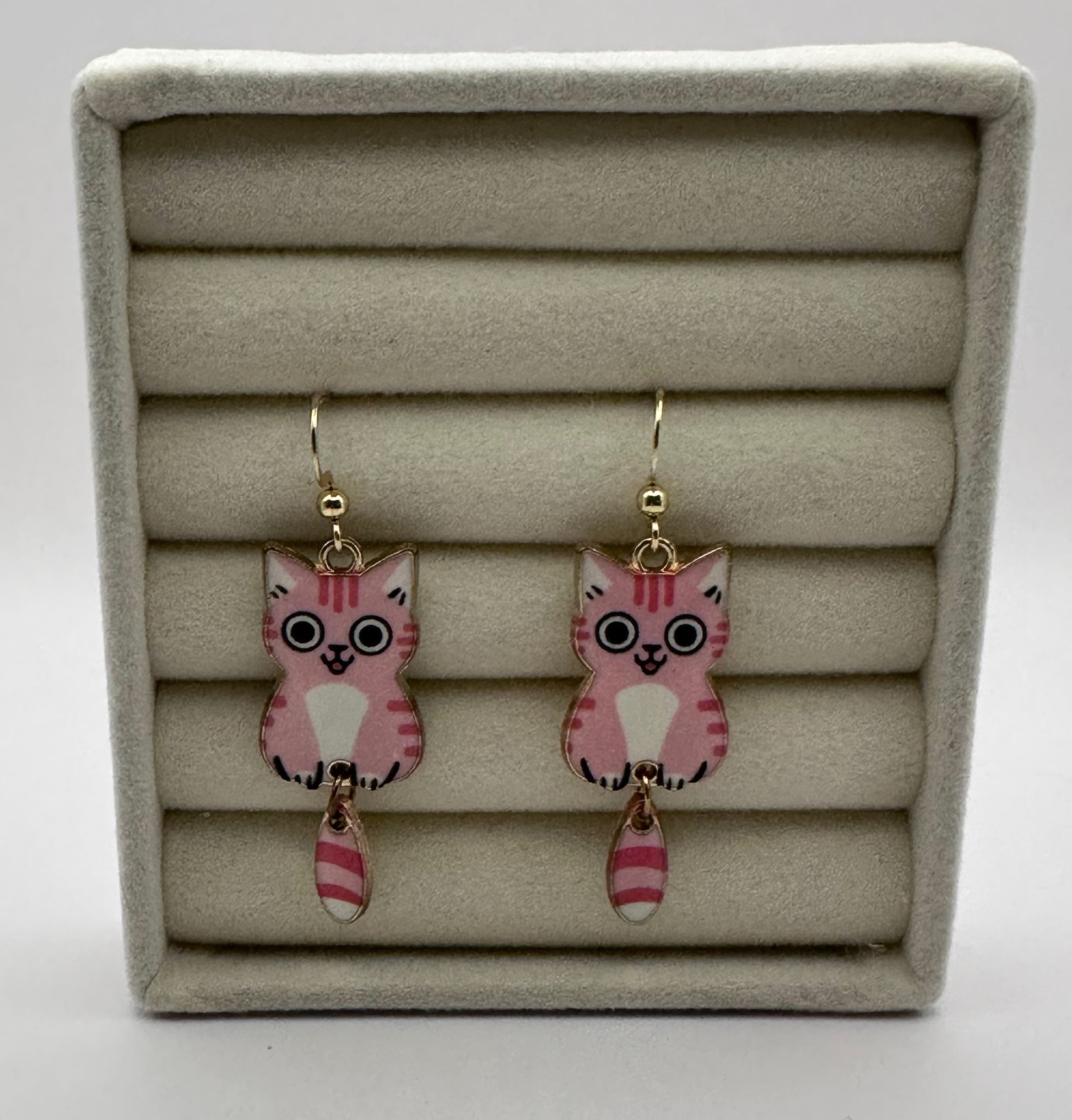 Adorable kitty cats with dangling tails. Painted matte finish. Made with 14k gold-filled hooks.