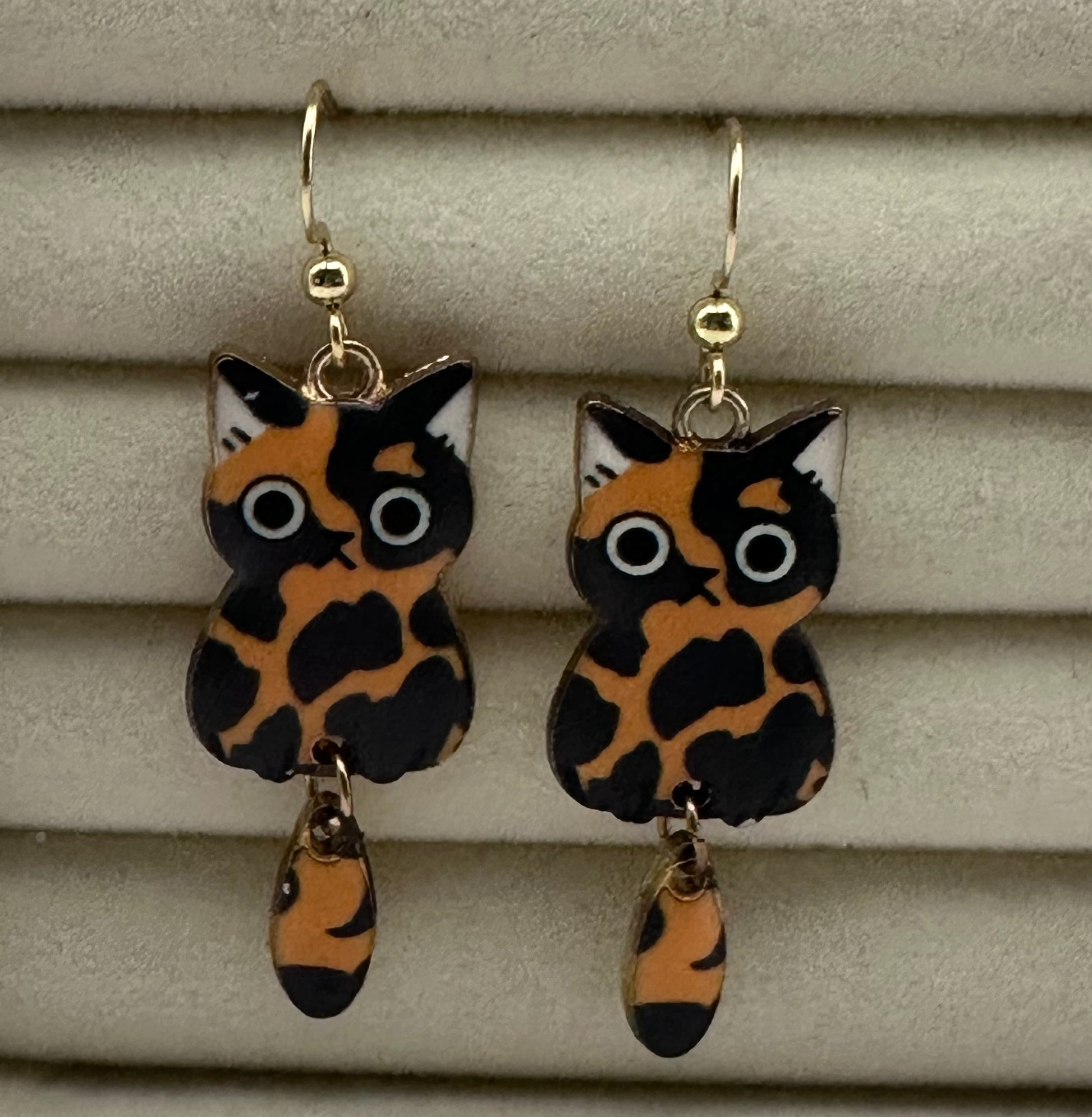 Adorable kitty cats with dangling tails. Painted matte finish. Made with 14k gold-filled hooks.