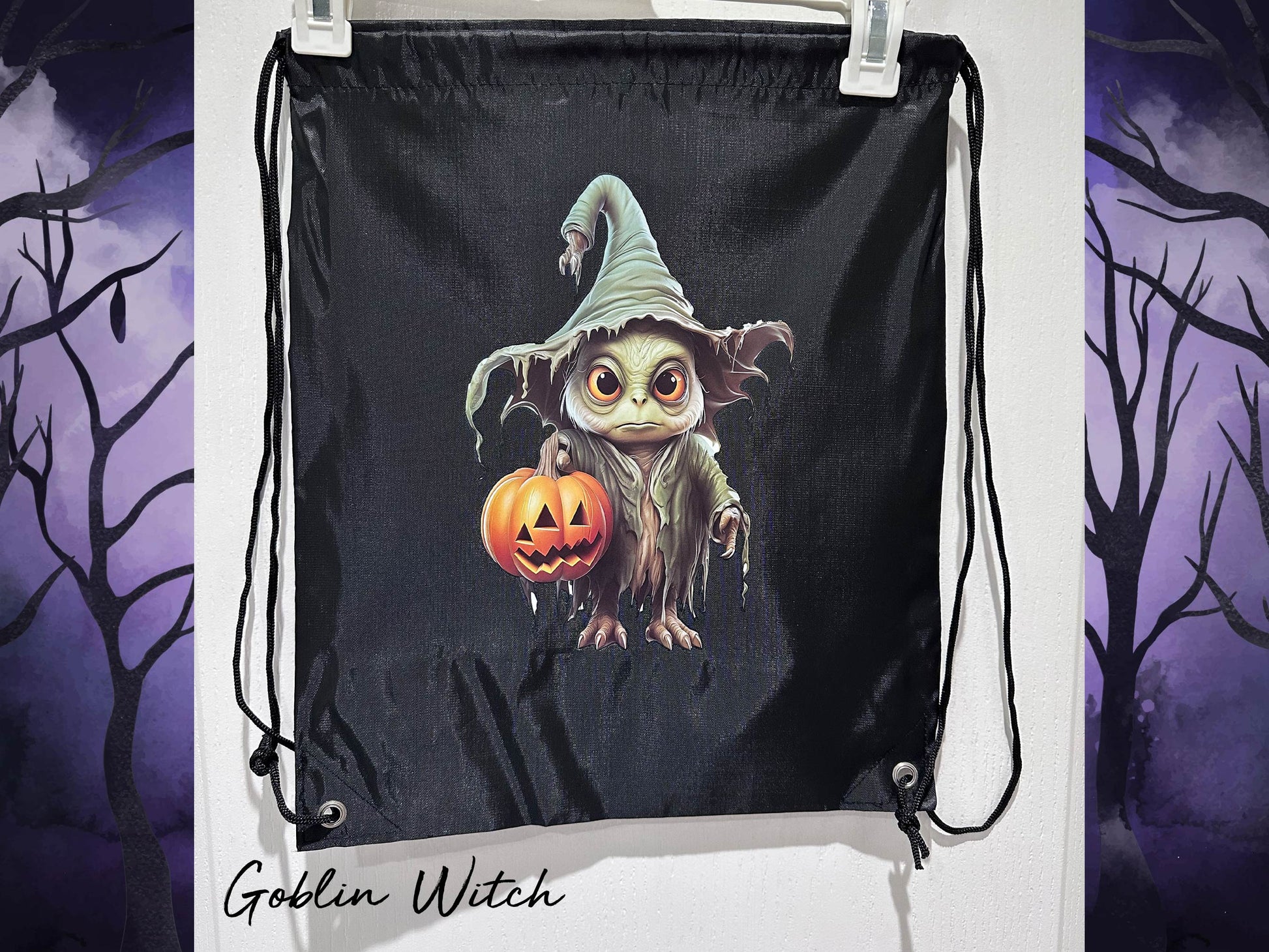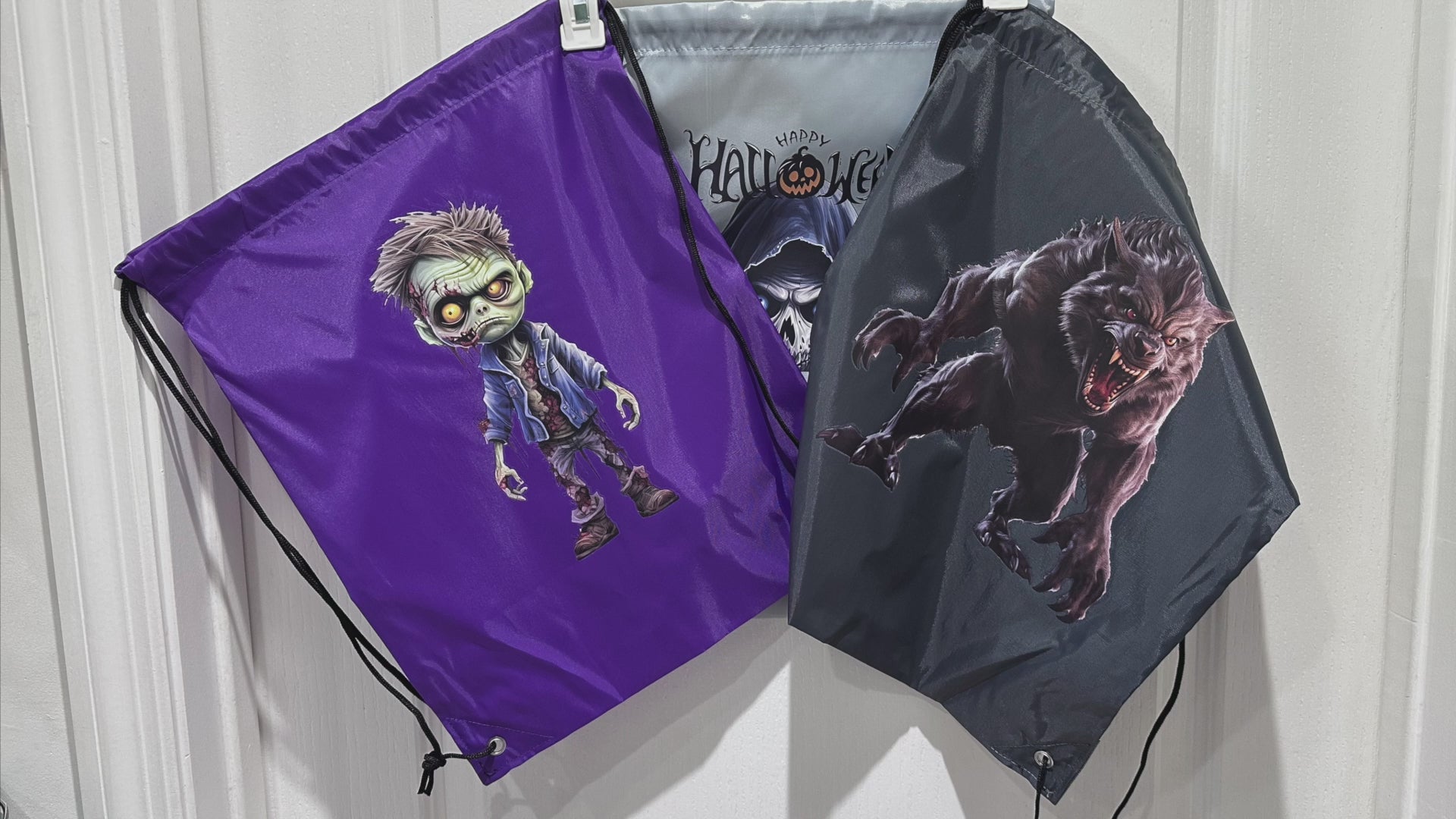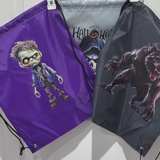 These budget-friendly backpack string bags have been heat-pressed with ghoulish Halloween designs. Bags may have slight imperfections but designs are intact and bags are fully functional.