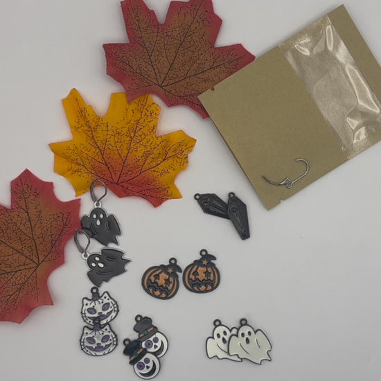 Now you can show off your BOO!-ness throughout the season. You'll receive three 14k gold-filled or stainless steel leverbacks (a pair + one extra) and 6 pair ups of swappable Halloween themed enamel charms. Mix and match for countless combinations!