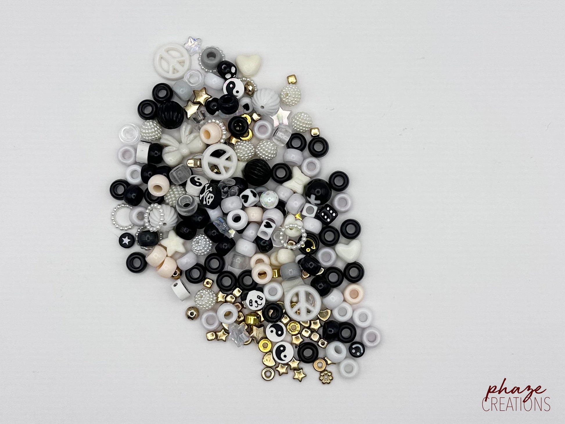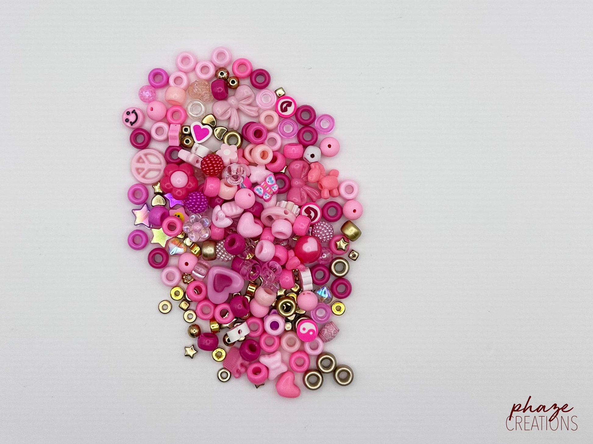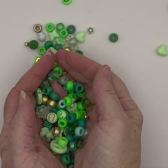 Each set includes a handpicked quantity of colorful ponies (includes solid, translucent, iridescent, glitter, etc.), clay, acrylic shapes, and more. Also included are gold and/or silver colored accent beads! Please note that not all bead designs are available in every color, and the pictures depict an example of the mix you will receive.