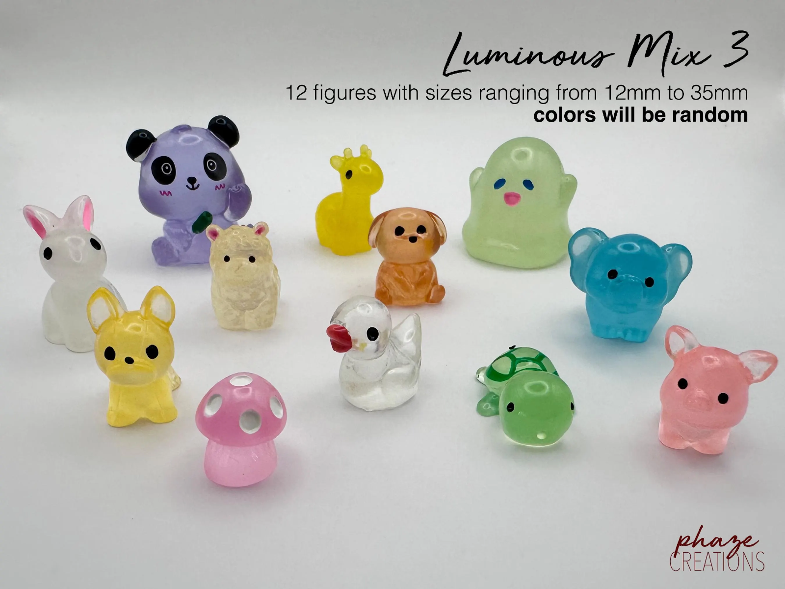 Hand-curated set of 12 luminous figures. Designs as shown, colors will vary per set. These are colorful and translucent in the light, and offer varying levels of glow in the dark.*