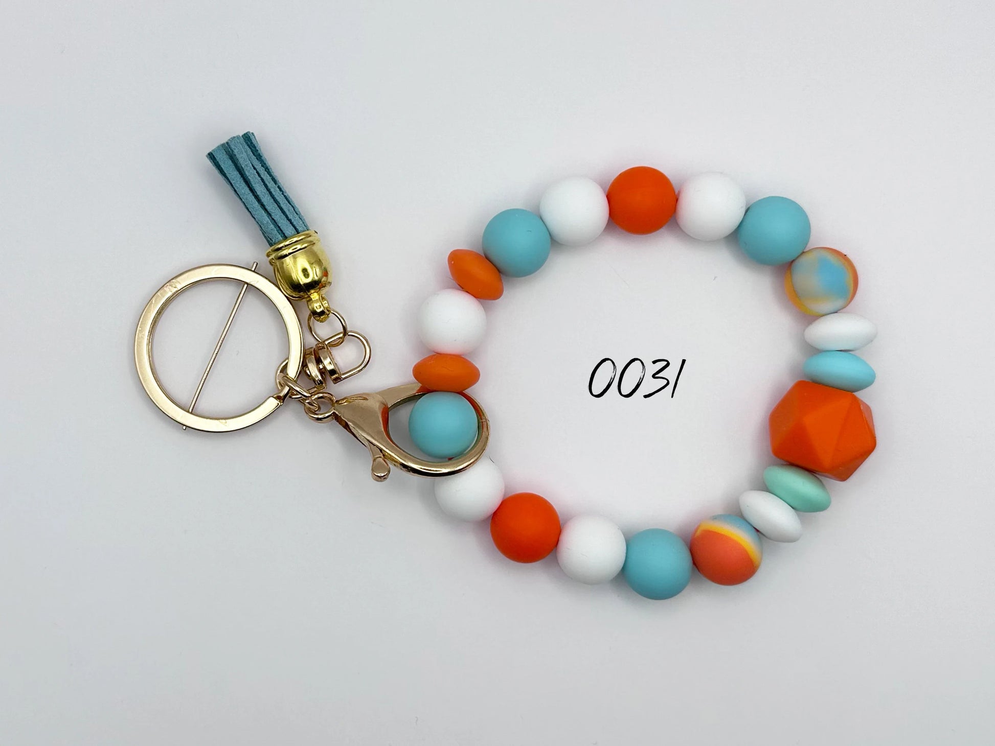 These silicone wristlet keychains make excellent gifts for all occasions. Made using 15mm and 12mm food-grade silicone beads and various embellishments, they’re comfortable and eye-catching. Want to wear one as a standalone bracelet? Simply unhook the keychain portion and you’re good to go.