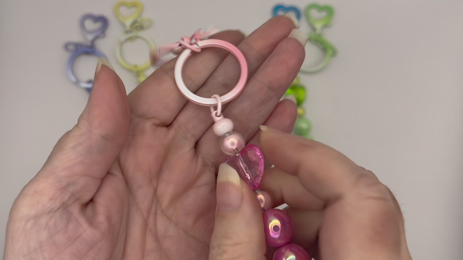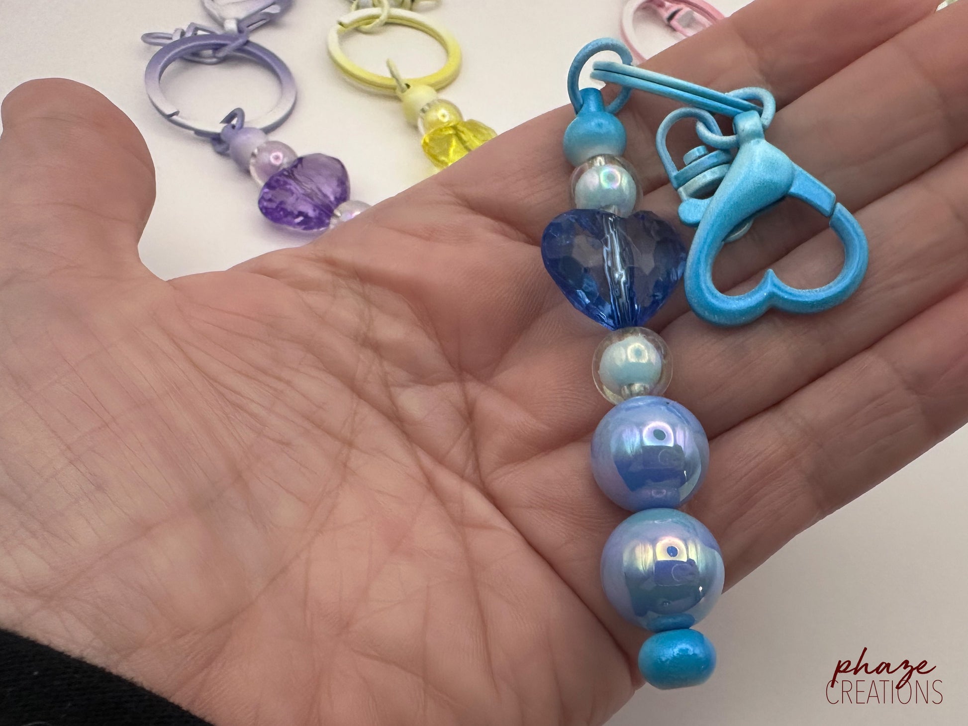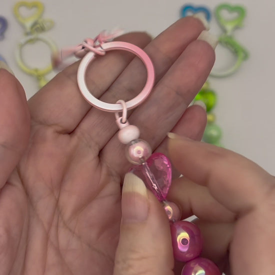 These whimsical beaded keychains feature a pastel "swirl" key ring and heart clasp, and acrylic beads. Choose from Purple, Yellow, Pink, Blue, and Green.