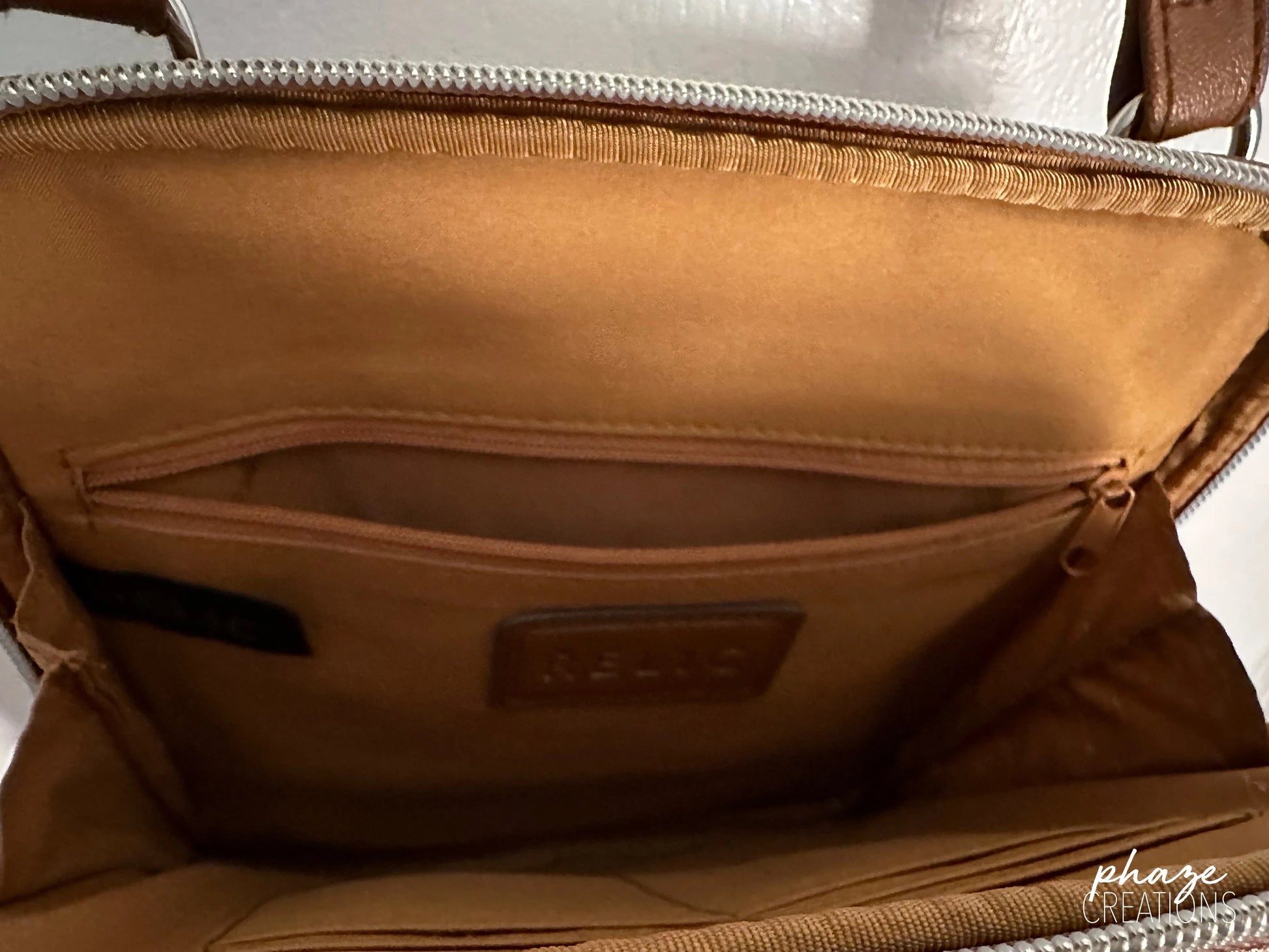 This Relic bag has the original coated exterior (similar to a coated canvas). It features a non-removable strap attached to D rings that is adjustable from approximately 28 inches to 54 inches, making it both a shoulder and crossbody bag.